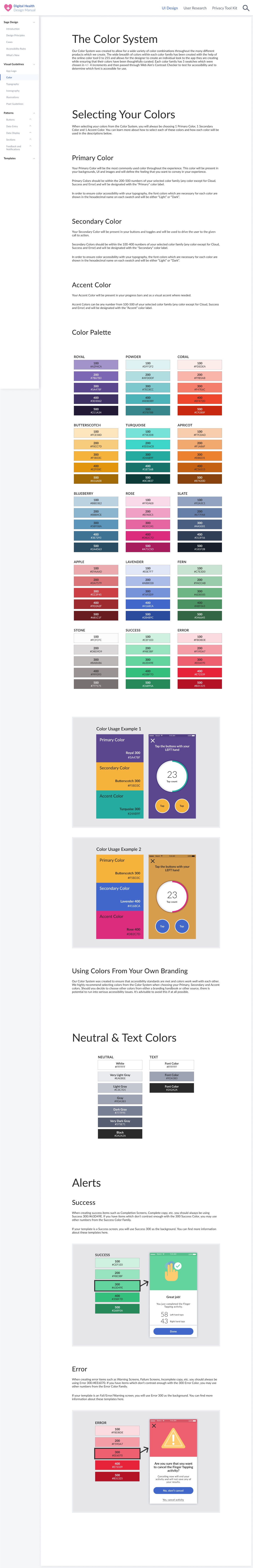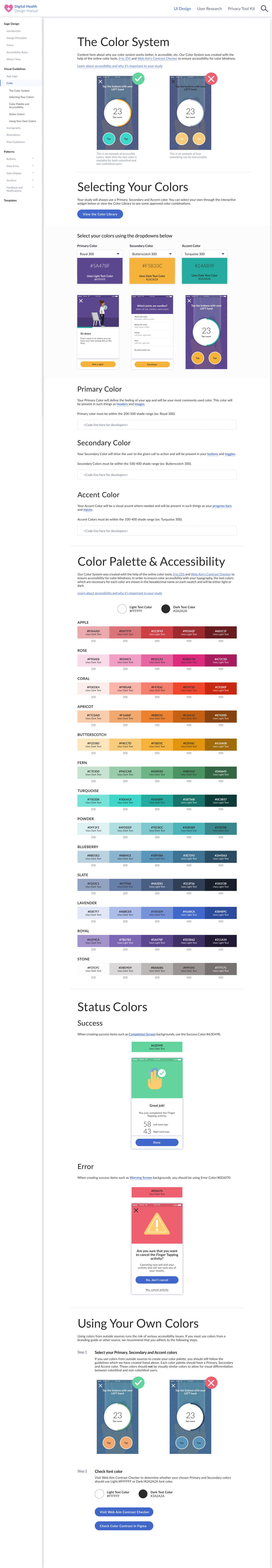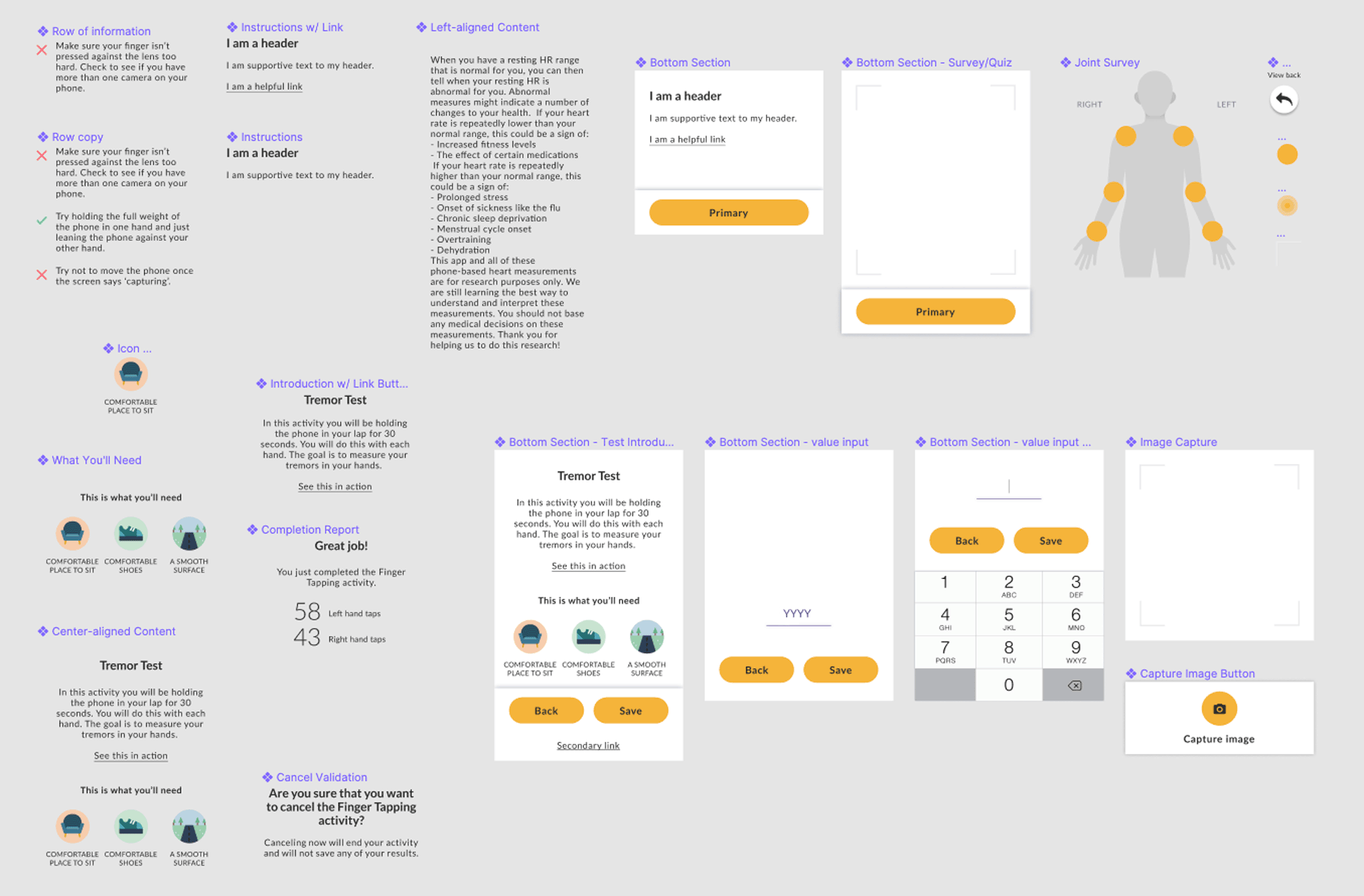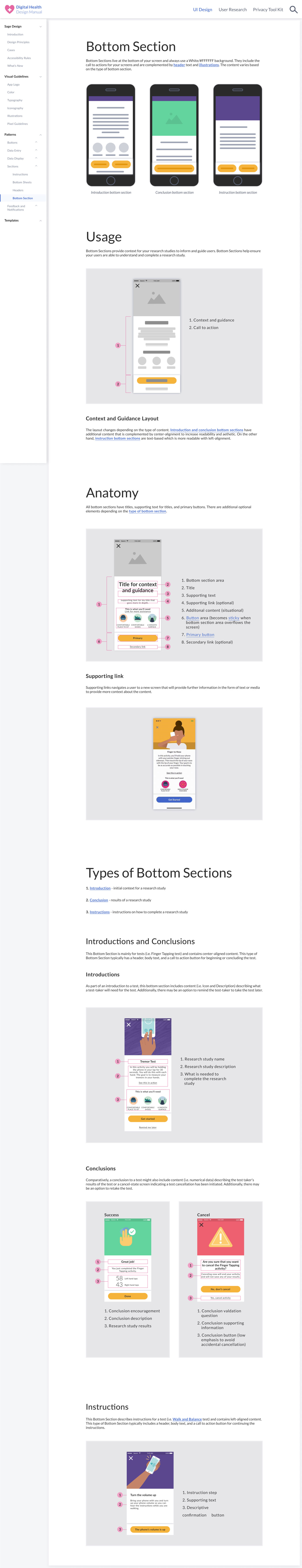Initially, we created a design system page called the "Bottom Section" to provide users with all the necessary components to create their own digital health applications. However, during user interviews, we realized that the name was confusing, and I questioned the purpose of the page itself. As one of Sage Bionetworks' design principles is to "Do the hard work so the users don't have to," I reprioritized the design system, to focus on complete digital health assessment applications and screen templates that research scientists and developers could use easily. Although we shifted the focus of the design system, the prior research we conducted was still helpful. Some implemented feedback includes: